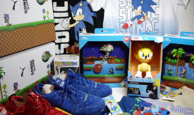 Zwei Sonic Boom8 Figuren von Metal Sonic und Dr. Eggman, ein Sonic Club Mocchi Mocchi Plüschkopf, ein 30th Anniversary Pinset, ein Phone & Controller Halter von Amy, ein Basecap, eine Tasse, ein Fußball-Trikot-set, ein Paar Socken und eine Sonic Dance Musik-CD.