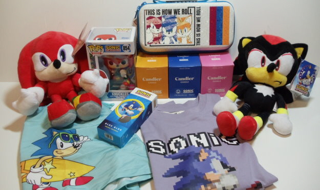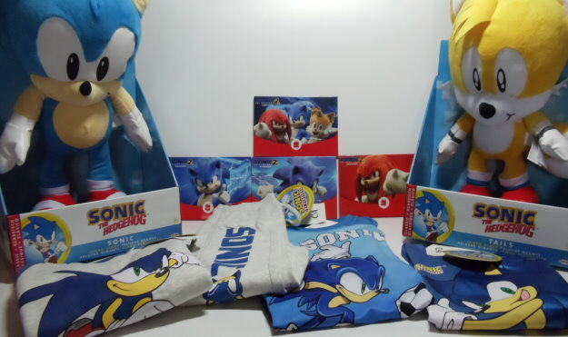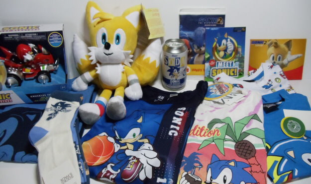 Ein Doppelpack Pyjamas, ein Pyjama, ein Basketballset bestehend aus Tanktop und Shorts, ein T-Shirt, ein 5er-Pack Socken, eine Plüschfigur von Tails, ein Pullback Racer mit Knuckles, eine Funko Soda Sonic Figur, ein Büchlein und ein Maze-Game beide von McDonald´s.
