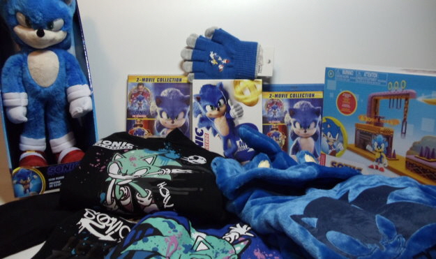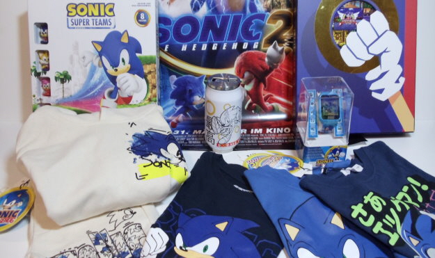 Vier mal der Sonic the Hedgehog 2 Film auf Disc (4K Steelbook, 4K, Blu-Ray und DVD), ein Geschenkset mit Tasse und Socken, ein Phone- und Controller-Holder von Sonic, ein Hemd, ein Doppelpack Beanies, ein 5er Pack Shorts und eine Funko Sonic Flocked Soda Figur.