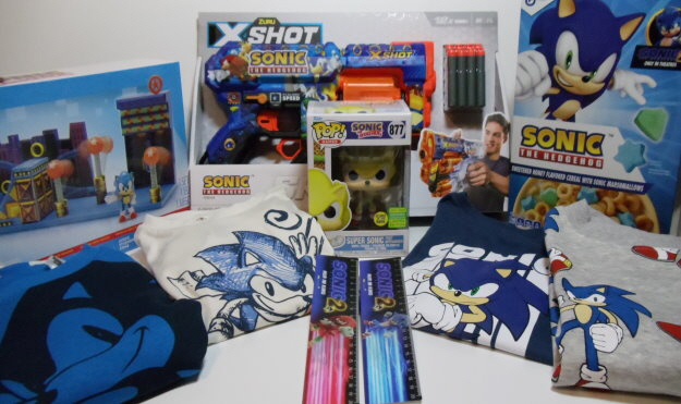 Für die Kids: Zwei Pullover, ein Pyjama und ein Langarmshirt. Dazu zwei Lineale vom Sonic the Hedgehog 2 Movie von Sonic und Knuckles, eine Funko-Pop-Figur von Super Sonic, ein Studiopolis Zone Spielset, eine X-Shot Spielzeug-Waffe und eine Packung “Frühstücksringe”.
