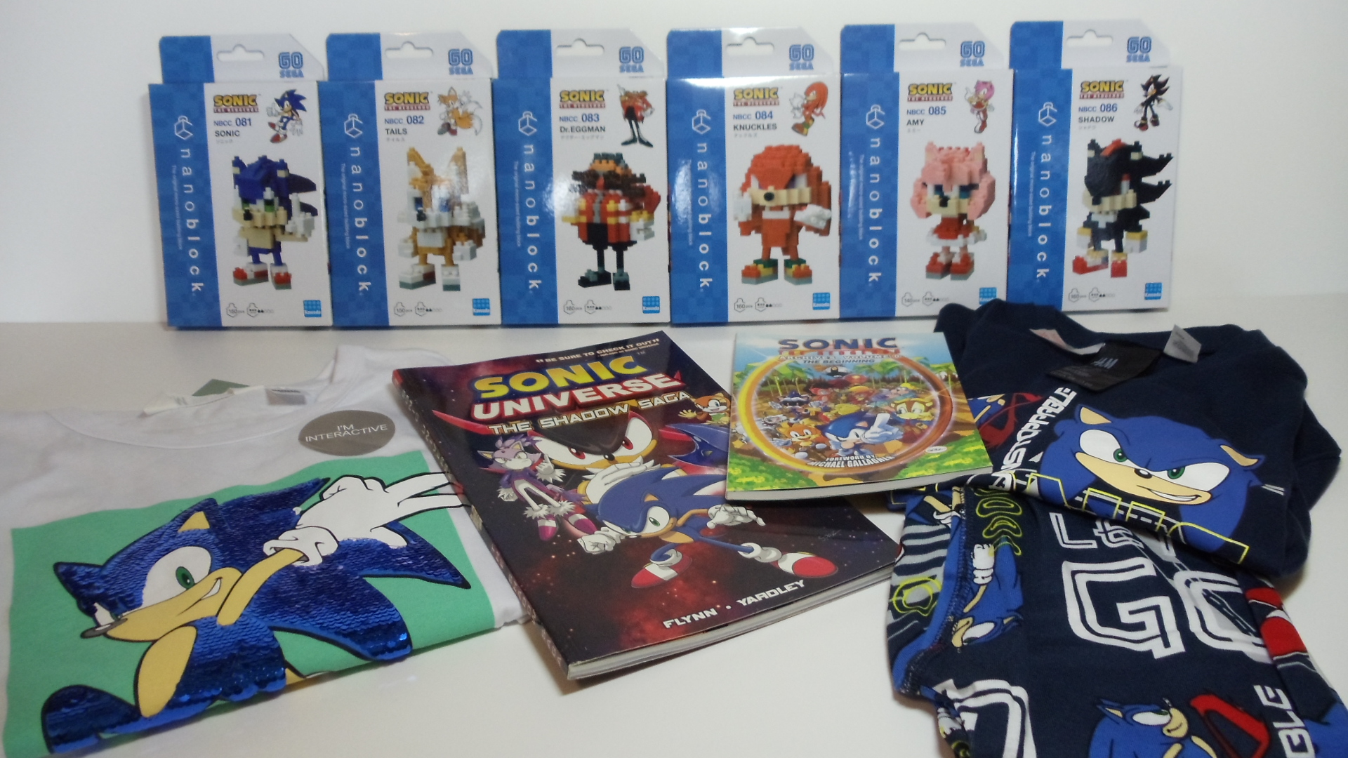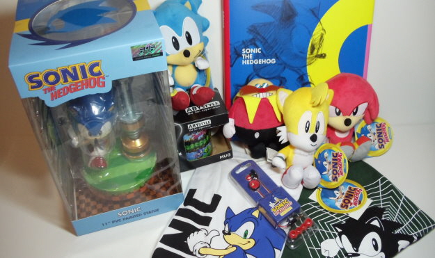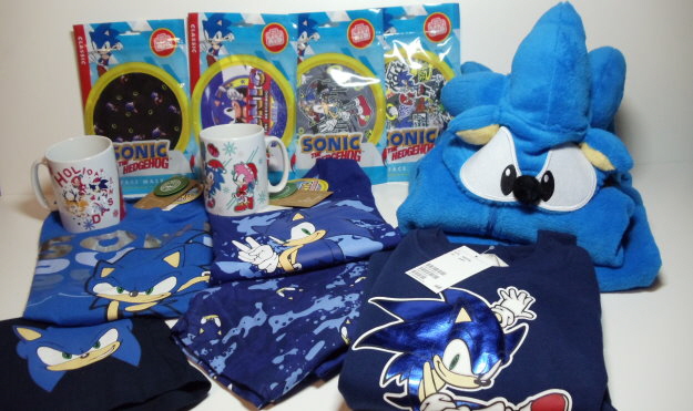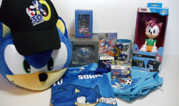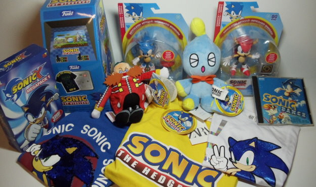 Zwei Sonic Boom8 Figuren von Metal Sonic und Dr. Eggman, ein Sonic Club Mocchi Mocchi Plüschkopf, ein 30th Anniversary Pinset, ein Phone & Controller Halter von Amy, ein Basecap, eine Tasse, ein Fußball-Trikot-set, ein Paar Socken und eine Sonic Dance Musik-CD.