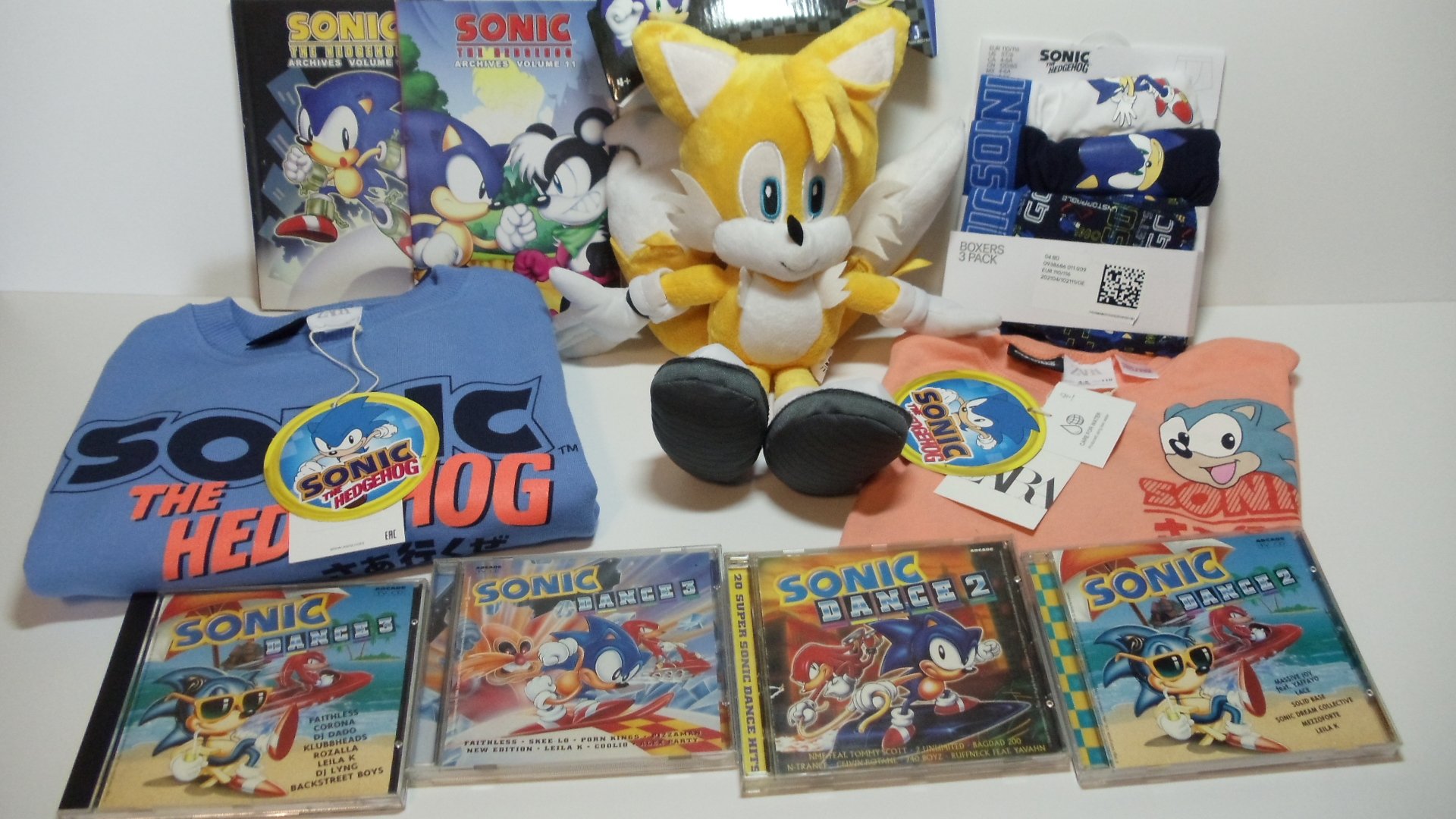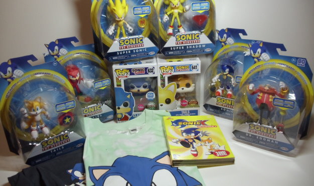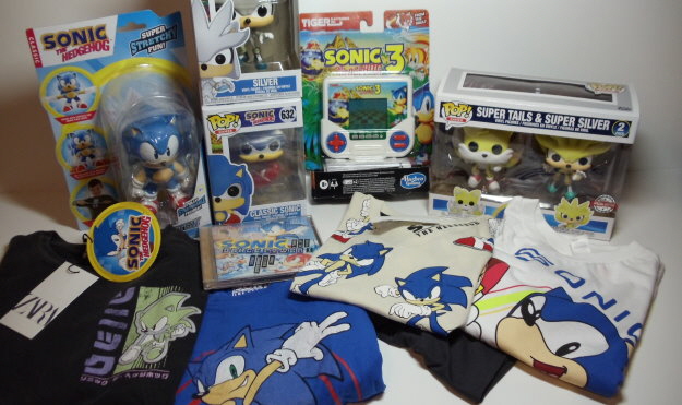 Zwei Funko Pop Figuren von Sonic und Silver, ein Doppelpack Funko Pop Figuren mit Super Tails und Super Silver, ein Strech Sonic, ein LCD-Handheld von Sonic the Hedgehog 3, eine Sonic Dance Power Musik-CD und für die Kids: zwei T-Shirts, ein Sweatshirt und ein kurzer Pyjama.