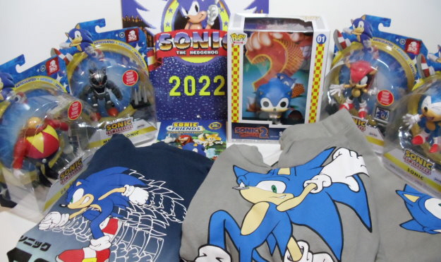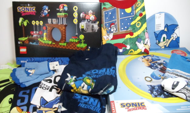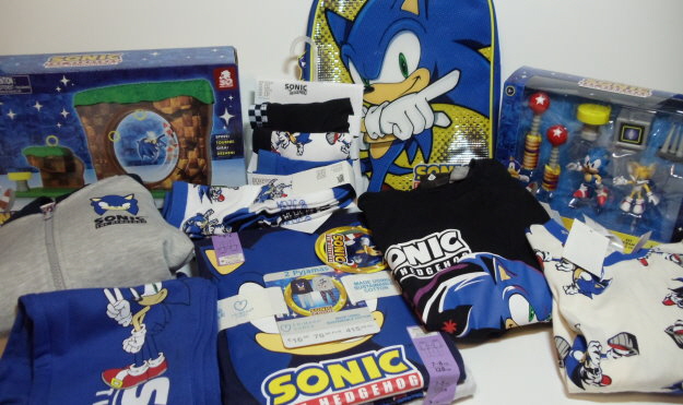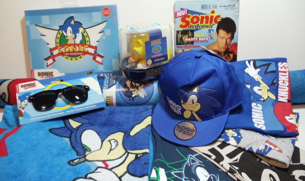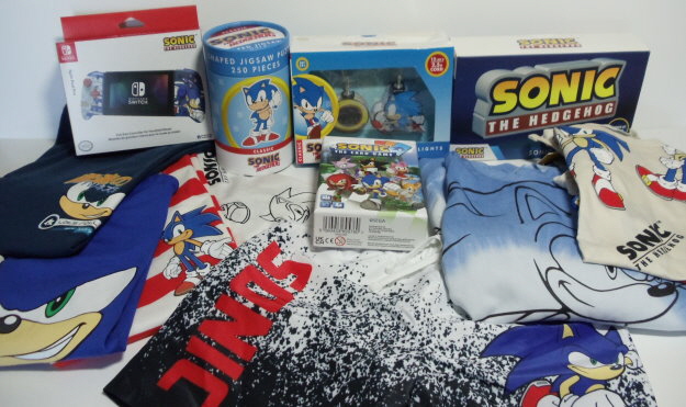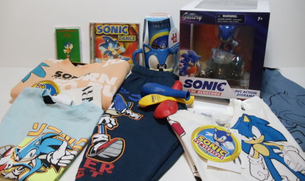 Ein Doppelpack Pyjamas, ein Pyjama, ein Basketballset bestehend aus Tanktop und Shorts, ein T-Shirt, ein 5er-Pack Socken, eine Plüschfigur von Tails, ein Pullback Racer mit Knuckles, eine Funko Soda Sonic Figur, ein Büchlein und ein Maze-Game beide von McDonald´s.