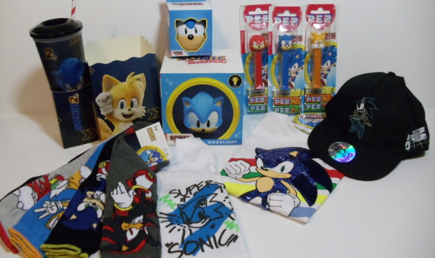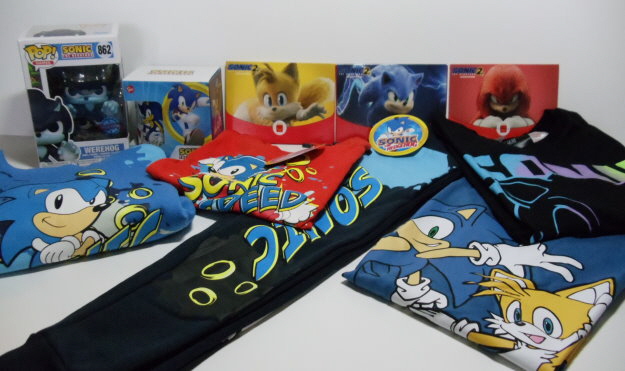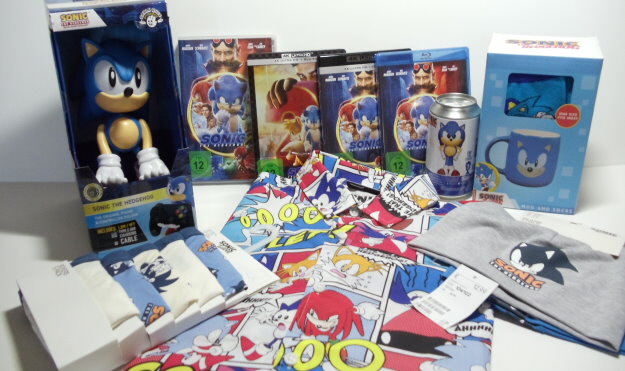 Vier mal der Sonic the Hedgehog 2 Film auf Disc (4K Steelbook, 4K, Blu-Ray und DVD), ein Geschenkset mit Tasse und Socken, ein Phone- und Controller-Holder von Sonic, ein Hemd, ein Doppelpack Beanies, ein 5er Pack Shorts und eine Funko Sonic Flocked Soda Figur.